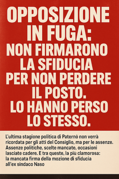 In primo piano 🟥 Paternò, la resa dell’opposizione: “Non volevano andare a casa”. Ma ci sono andati lo stesso. Pubblicato 2 giorni fa il 25 Novembre 2025 di QTSICILIA.INFO Share Tweet di Redazione – L’ultima stagione politica di Paternò non verrà ricordata per gli atti del Consiglio, ma per le assenze della politica, per scelte mancate, per le occasioni lasciate cadere. E tra queste, la più clamorosa è la mancata firma della mozione di sfiducia all’ex sindaco Naso. Un gesto non fatto, una posizione non presa, che oggi pesa più di qualunque voto espresso in aula. Perché quella firma mancata ha marchiato a fuoco sette consiglieri d’opposizione: Salvo Tomasello, Ionella Catena, Gabriele Di Fazio, Michele Russo, Salvo Malerba, Lucio Cunsolo e Salvo Borzì. La verità nuda? Volevano salvare la poltrona. Si può girare la motivazione in mille modi. Si possono trovare venti giustificazioni. Ma la percezione che corre tra i cittadini è una sola, brutale: “Non firmarono perché non volevano andare a casa. Solo che la storia è beffarda e ha deciso per loro, a casa ci sono andati lo stesso, con lo scioglimento per mafia. E ci sono andati con un biglietto di sola andata che oggi rende quasi impossibile immaginare un ritorno. Leggeremo le motivazioni allegate al decreto per conoscere l’incandidabilità che potrebbe essere comminata anche a qualche consigliere comunale. Questa è stata un’opposizione che ha scelto di non opporsi. Quando Paternò aspettava un segnale, loro hanno esitato. Quando serviva coraggio, loro hanno scelto il “vediamo”. Quando la città chiedeva responsabilità, hanno preferito “non rischiare”. Il risultato? La città è stata travolta, il Consiglio sciolto, e loro, gli oppositori “prudenziali”, sono rimasti impigliati nella rete delle loro stesse “non mosse”. Oggi sono senza un ruolo, senza una linea, senza una narrativa. Il vero dramma politico per i sette non è solo la decadenza. Il vero dramma è ciò che resta, un’etichetta pesante, una reputazione incrinata, una reazione pubblica impietosa. Per molti, oggi rappresentano l’immagine plastica dell’opposizione che non si oppone, della politica che sceglie il galleggiamento, non il coraggio. Per questi sette il futuro appare così. Il popolo, in vista del nuovo ciclo politico, vuole rinnovamento. Vuole discontinuità. Vuole liberarsi da qualunque ombra della stagione precedente. Salvando tutti quelli che hanno assunto chiare posizioni, opponendosi realmente alla disastrosa amministrazione che ha governato per ben otto anni, che ha creato disastri oggettivi ed è stata mandata a casa per infiltrazioni mafiose. E il paradosso è micidiale che ci fa sorridere: per non perdere la poltrona hanno fatto la mossa che oggi rischia di chiudergli il futuro e un’immagine politica difficile da ripulire. Una cosa è certa, a Paternò la memoria politica è feroce. E questo episodio resterà nella storia locale come uno dei più evidenti boomerang politici degli ultimi anni. La città non dimentica. P.S.- Di segutio pubblichiamo la richiesta all’ordine del giorno della mozione di sfiducia, mai presentata in quanto mancava la decima firma. Ricordiamo che se i sette dell’opposizione non solo avessero firmato ma anche votato la sfiducia (16 voti), sarebbe passata. Non altro da dire. Voci correlate:Featuredmozionedisfiduciaopposizionepaternò Potrebbero interessarti 🟥 PARLIAMO DELLE INCANDIDABILITÀ DI AMMINISTRATORI E CONSIGLIERI (D.lgs. 18 agosto 2000, n. 267) Paternò, il sistema degli incarichi: viaggio dentro il “cerchio magico da Cumacca” 🐸 PATERNÒ, UN TERREMOTO Ultim'ora Più letti Video In primo piano14 ore fa IL CASO MANLIO MESSINA SCUOTE FRATELLI D’ITALIA In primo piano1 giorno fa 🟥 PARLIAMO DELLE INCANDIDABILITÀ DI AMMINISTRATORI E CONSIGLIERI (D.lgs. 18 agosto 2000, n. 267) In primo piano2 giorni fa Referendum Giustizia: La posizione di Falcone secondo le sue parole autentiche In primo piano2 giorni fa 🟥 Paternò, la resa dell’opposizione: “Non volevano andare a casa”. Ma ci sono andati lo stesso. In primo piano3 giorni fa Paternò, il sistema degli incarichi: viaggio dentro il “cerchio magico da Cumacca” Politica3 giorni fa Regione, La manovra “robusta”, la paralisi del nuovo e il suicidio assistito delle funzioni dell’Ars Politica4 mesi fa UNA SPLENDIDA SERATA A PATERNÒ. INTERVIENE IL CONSIGLIERE LORENZO TERRANOVA Politica3 mesi fa 📊 INTENZIONI DI VOTO: PATERNÒ SCEGLI IL SINDACO DEL FUTURO (voto anonimo) In primo piano4 mesi fa CATANIA: CORTOCIRCUITO FDI VS. TRANTINO. LA CONSIGLIERA PARISI ALL’ATTACCO In primo piano3 mesi fa IL SINDACO NASO SBARELLA, SPETTACOLO GROTTESCO IN CONSIGLIO COMUNALE In primo piano4 mesi fa Manlio Messina: “Emarginato da FdI. Ecco perché me ne sono andato” In primo piano4 mesi fa ‼️ Sensazionale, la consigliera Benfatto si auto-sospende da FdI. La sua nota. In primo piano14 ore fa IL CASO MANLIO MESSINA SCUOTE FRATELLI D’ITALIA In primo piano5 giorni fa QTS TG FLASH del 22 11 – I COMMISSARI; CIANCITTO; PER NON DIMANTICARE; LA LIBERTÀ In primo piano6 giorni fa PATERNÒ COMMISSARIATA, LA VERITÀ CHE BRUCIA: QUI NON CI SONO “SCIALLELLI”, CI SONO RESPONSABILI In primo piano2 settimane fa CATANIA, Pellegrino vs. Trantino: La morale “è che al Cavaliere Nero non gli devi cacà er cazzo” ( cit.Gigi Proietti) Politica3 settimane fa PD PATERNÒ, QUANDO LA REDENZIONE SI SCONTRA CON LA MORALE POLITICA In primo piano4 settimane fa MANLIO MESSINA, COSA VUOL DIRE ESSERE UOMO LIBERO Sondaggi