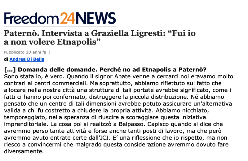Pubblichiamo, quindi, qui di seguito una intervista, di dieci anni fa, proprio alla sindaca, dove lei stessa afferma: “Fui io a non volere Etnapolis”: