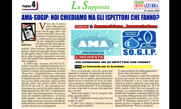 Visto che le attenzioni sulla partecipata comunale non sono solo di oggi, tant’è che è stata nominata una commissione d’inchiesta che per le verità non ha mai iniziato i lavori, malgrado la pubblicità fatta all’atto dell’adozione dell’atto in consiglio comunale. Altro mistero. Quindi vorremmo mettere chiarezza ponendo alcune domande alle quali come al solito nessuno, … Leggi tutto AMA-SOGIP: NOI CHIEDIAMO, MA GLI ISPETTORI CHE FANNO?