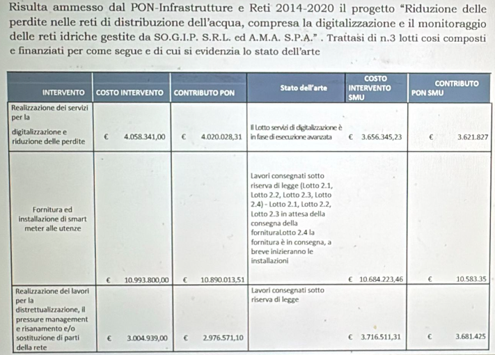 Lo sapevate che l’AMA Spa, insieme alla SO.G.I.P., hanno ricevuto complessivamente un finanziamento di oltre 18milioni di euro, tramite le risorse del programma europeo “React-Eu”, Digitalizazione e riduzione perdite reti idriche. L’intervento prevedeva la digitalizzazione e il monitoraggio delle reti al fine della riduzione delle perdite idriche sulle reti gestite dalle società SO.G.I.P. ed A.M.A., che riguarda la realizzazione dei servizi di rilievo della rete, implementazione del GIS, l’implementazione dell’Asset management, la realizzazione del modello matematico, la ricerca delle perdite, individuazione e progettazione degli interventi necessari alla distrettualizzazione ed alla implementazione del sistema di pressure management.