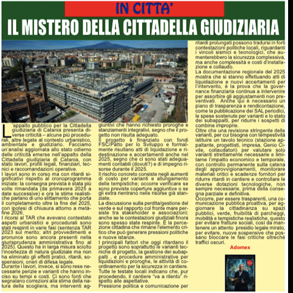 L’appalto pubblico per la Cittadella giudiziaria di Catania presenta diverse criticità – alcune più procedurali, altre legate al contesto urbanistico, ambientale e giudiziario.Facciamo un’analisi aggiornata allo stato odierno delle criticità emerse nell’appalto della Cittadella giudiziaria di Catania, con stato lavori, profili legali, finanziari, tecnici e raccomandazioni operative.