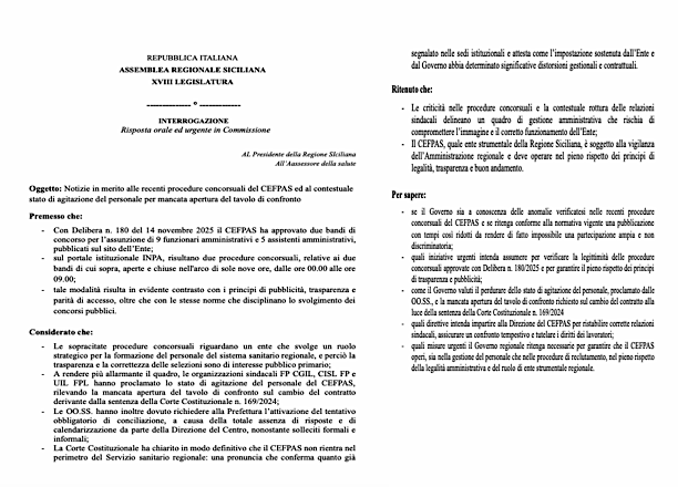 In primo piano CEFPAS, ENNESIMO SCANDALO NELLA SANITÀ SICILIANA (con l’aggravante della recidività) Pubblicato 2 giorni fa il 19 Novembre 2025 di QTSICILIA.INFO Share Tweet Voci correlate:cefpasFeaturedregionesicilianasanità Potrebbero interessarti CEFPAS CALTANISSETTA, CI RISIAMO, CONCORSO LAMPO PER SOLI “NOTTAMBULI”, È UNA GUERRA QTS TG FLASH DELLA SERA 15.11.25. VELODROMO PATERNÒ; GOSSIP CATANIA; REGIONE SICILIANA; ROBERTO FICO. NON CAMBIANO MAI …”fino alla fine” Ultim'ora Più letti Video Politica20 minuti fa PATERNÒ COMUNE SCIOLTO PER MAFIA In primo piano4 ore fa PATERNÒ: 20 NOVEMBRE FESTA DELLA LIBERAZIONE In primo piano1 giorno fa QTS TG FLASH del 20.11. SCHIFANI; FRATELLI D’ITALIA PATERNÒ; GIUSTIZIA In primo piano2 giorni fa CEFPAS, ENNESIMO SCANDALO NELLA SANITÀ SICILIANA (con l’aggravante della recidività) Politica3 giorni fa CEFPAS CALTANISSETTA, CI RISIAMO, CONCORSO LAMPO PER SOLI “NOTTAMBULI”, È UNA GUERRA In primo piano3 giorni fa TG FLASH 18.11 – MUSUMECI; BOTTINO; FICO; GRATTERI; MIELI. Politica4 mesi fa UNA SPLENDIDA SERATA A PATERNÒ. INTERVIENE IL CONSIGLIERE LORENZO TERRANOVA Politica3 mesi fa 📊 INTENZIONI DI VOTO: PATERNÒ SCEGLI IL SINDACO DEL FUTURO (voto anonimo) In primo piano4 mesi fa ⚠️ LA REGIONE SICILIANA E MAGALOMAN VANNO IN CRASH 💥 In primo piano3 mesi fa CATANIA: CORTOCIRCUITO FDI VS. TRANTINO. LA CONSIGLIERA PARISI ALL’ATTACCO In primo piano2 mesi fa IL SINDACO NASO SBARELLA, SPETTACOLO GROTTESCO IN CONSIGLIO COMUNALE In primo piano4 mesi fa ❌ REGIONE SICILIANA, MAGALOMAN MA ANCHE I SINDACI: L’ILLUSIONE DEL POTERE ASSOLUTO In primo piano6 giorni fa CATANIA, Pellegrino vs. Trantino: La morale “è che al Cavaliere Nero non gli devi cacà er cazzo” ( cit.Gigi Proietti) Politica2 settimane fa PD PATERNÒ, QUANDO LA REDENZIONE SI SCONTRA CON LA MORALE POLITICA In primo piano3 settimane fa MANLIO MESSINA, COSA VUOL DIRE ESSERE UOMO LIBERO Politica3 settimane fa VILLA MONCADA, FIORE ALL’OCCHIELLO (?) DELL’AMMINISTRAZIONE NASO. IL VIDEO Politica3 settimane fa STURMTRUPPEN, MANLIO VS. RENATO In primo piano1 mese fa Tutti compatti (o quasi) a Salvaguardia della Casta. Sondaggi