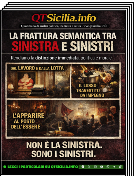 Qui non si demolisce la Sinistra. Qui si smaschera il suo contrario. I Sinistri sono coloro che abusano degli ideali della sinistra per il proprio tornaconto, li trasformano in ornamenti, li svuotano di conflitto e li rivendono come superiorità morale. Li depredano, li usano, li consumano. Ideali che non vanno indossati. Vanno praticati.