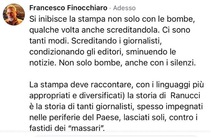 «La stampa deve raccontare, con i linguaggi più appropriati e diversificati la storia. Quella di Ranucci è la storia di tanti giornalisti, spesso impegnati nelle periferie del Paese, lasciati soli, contro i fastidi dei “massari”» (F. F.)