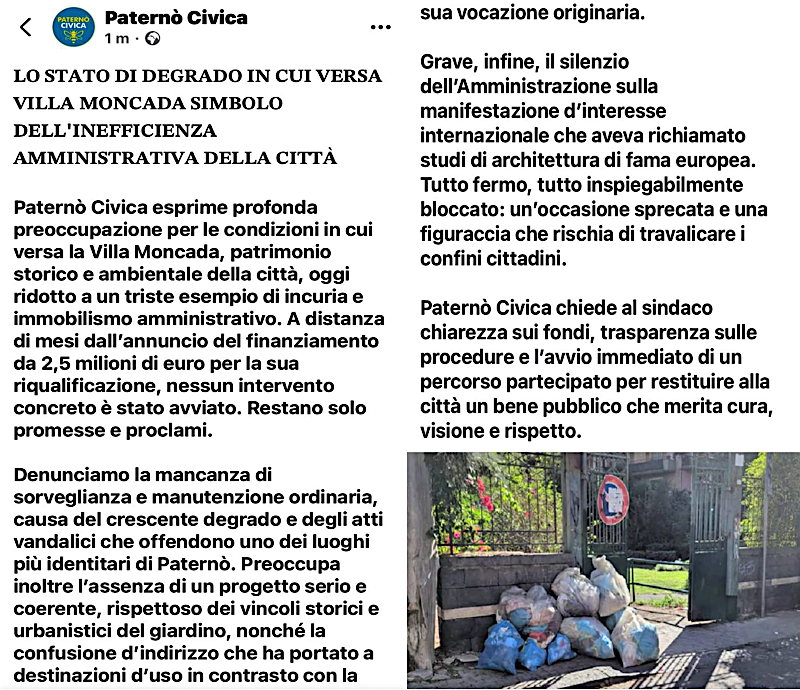 In primo piano PATERNÒ CIVICA: LO STATO DI DEGRADO DELLA VILLA MONCADA Pubblicato 4 ore fa il 28 Ottobre 2025 di QTSICILIA.INFO Share Tweet Rinveniamo sulla pagina FB di “Paternò Civica” [https://www.facebook.com/paternocivica] il post, che riprendiamo, sulle criticità Villa Moncada: Voci correlate:Featuredpaternòpaternòcivicavillamoncada Potrebbero interessarti VILLA MONCADA, FIORE ALL’OCCHIELLO (?) DELL’AMMINISTRAZIONE NASO. IL VIDEO PATERNÒ: SICUREZZA, L’ARIA NUOVA SCENDE IN PIAZZA L’INFORMAZIONE, EBBENE Sì, SIAMO QUI A SPALARE MERDA Ultim'ora Più letti Video In primo piano4 ore fa PATERNÒ CIVICA: LO STATO DI DEGRADO DELLA VILLA MONCADA Politica11 ore fa VILLA MONCADA, FIORE ALL’OCCHIELLO (?) DELL’AMMINISTRAZIONE NASO. IL VIDEO Politica1 giorno fa STURMTRUPPEN, MANLIO VS. RENATO In primo piano2 giorni fa PATERNÒ: SICUREZZA, L’ARIA NUOVA SCENDE IN PIAZZA In primo piano4 giorni fa L’INFORMAZIONE, EBBENE Sì, SIAMO QUI A SPALARE MERDA Politica4 giorni fa L’INFORMAZIONE HA IL DIRITTO/DOVERE DI CRITICA E DI SATIRA. CHI SCAPPA E NON RISPONDE HA SEMPRE TORTO In primo piano3 mesi fa IL CASO AMA. LA CONSIGLIERA BENFATTO: “ADESSO BASTA, FACCIO I NOMI” In primo piano3 mesi fa Regione Siciliana-Comune Catania e “mance”: l’ipocrisia regna sovrana! Politica3 mesi fa 🔴 EXCUSATIO NON PETITA ACCUSATIO MANIFESTA In primo piano3 mesi fa NON SEMU TUTTI I STISSI. FACCIAMO IL DISTINGUO. Parla la consigliera Benfatto Politica3 mesi fa REGIONE SICILIANA: MANCETTE E MANGIONI. TODOS CABALLEROS Politica3 mesi fa UNA SPLENDIDA SERATA A PATERNÒ. INTERVIENE IL CONSIGLIERE LORENZO TERRANOVA Politica11 ore fa VILLA MONCADA, FIORE ALL’OCCHIELLO (?) DELL’AMMINISTRAZIONE NASO. IL VIDEO Politica1 giorno fa STURMTRUPPEN, MANLIO VS. RENATO In primo piano2 settimane fa Tutti compatti (o quasi) a Salvaguardia della Casta. In primo piano2 settimane fa Paternò, Un consiglio comunale che si apre col botto e finisce con una bomba In primo piano2 settimane fa SCUOLA: LE MAMME CORAGGIO E LA REPRESSIONE DEL REGIME NASISTA – VIDEO E INTERVISTE DELLA MANIFESTAZIONE In primo piano1 mese fa L’ORCHESTRA SUONA MENTRE IL TITANIC AFFONDA Sondaggi