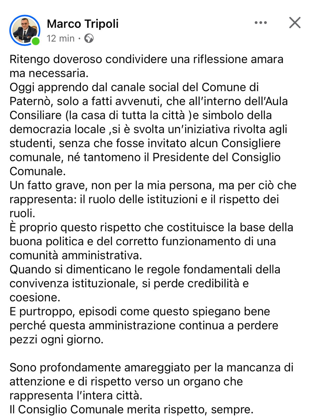 Ci chiediamo: Ma di cosa si meraviglia mai il presidente del consiglio comunale Marco Tripoli che affida ai social la propria irritazione? Questa è diventata la regola. È una delle tante, troppe, anomalie, per non dire altro, istituzionali perpetrate dal regime nasista, che vediamo e denunciamo da anni, ma che nessuno, di chi è contro questo regime deleterio, ha colto. Per comodità? Solo quando ci viene toccata la coda si reagisce? La regola per il regime nasista è, tra l’altro, appropriarsi di “cose” altrui. Qui, il sindaco Naso e l’assessore Coluccio, oltre a questo si sono appropriati anche fisicamente dell’aula consiliare, al fine per propagandare un progetto che aveva redatto la IV commissione consiliare e che loro hanno reso pubblico, non condividendolo con altri. Non solo non viene invitato il presidente del consiglio, che nulla sapeva dell’invasione di campo, ma anche nessuno dei consiglieri. Bisogna avere una buona dose di pazienza in attesa dell’arrivo della ramazza? Oppure dichiarare pubblicamente fatti, opinioni, circostanze affinché vengano riportate nel libro della storia a futura memoria? Ricordando che il silenzio è complicità!