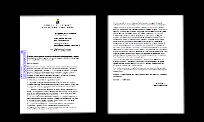 Un consiglio comunale che si apre col botto. Il sindaco tenta di impedire la seduta con una sua nota, ma il presidente Tripoli risponde per le rime e dà avvio alla seduta, ecco le due note: