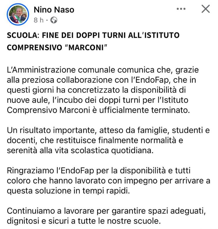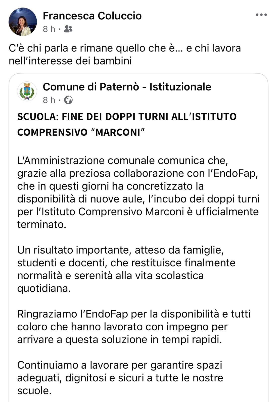 Il capogruppo di Fratelli d’Italia nel proprio intervento, vero, introduce qualche critica nei confronti dell’amministrazione, ma alla fine facendo l’annuncio che i problemi delle classi è stato risolto, per cui i doppi turni sono stati scongiurati, è come fare, a nostro avviso, uno spot propagandistico all’amministrazione Naso, nulla dice del problema complessivo che investe le scuole.