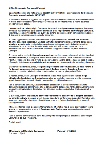 Un consiglio comunale che si apre col botto. Il sindaco tenta di impedire la seduta con una sua nota, ma il presidente Tripoli risponde per le rime e dà avvio alla seduta, ecco le due note: