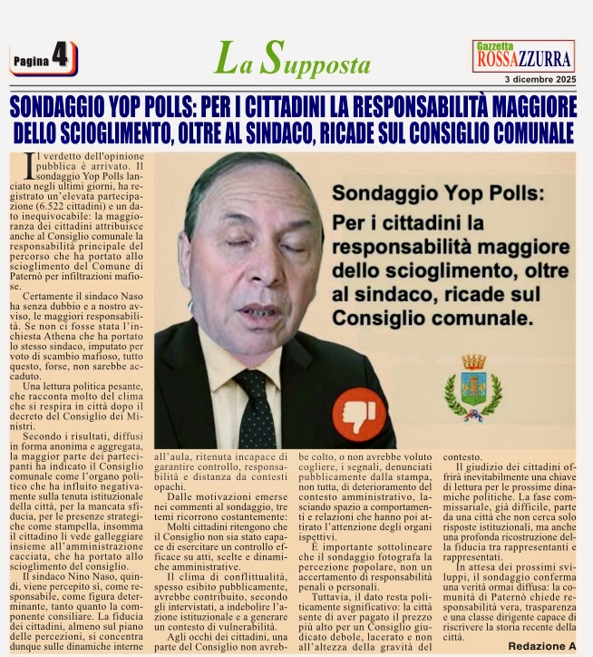 Il verdetto dell’opinione pubblica è arrivato. Il sondaggio Yop Polls lanciato negli ultimi giorni, ha registrato un’elevata partecipazione (6.522 cittadini) e un dato inequivocabile: la maggioranza dei cittadini attribuisce anche al Consiglio comunale la responsabilità principale del percorso che ha portato allo scioglimento del Comune di Paternò per infiltrazioni mafiose. Certamente il sindaco Naso ha senza dubbio e a nostro avviso, le maggiori responsabilità. Se non ci fosse stata l’inchiesta Athena che ha portato lo stesso sindaco, imputato per voto di scambio mafioso, tutto questo, forse, non sarebbe accaduto.