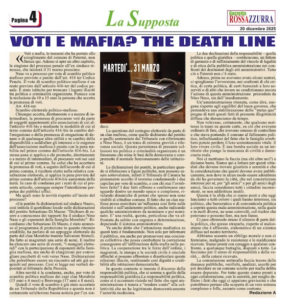 Naso va a processo per voto di scambio politico mafioso previsto e punito dall’art. 416 ter Codice Penale. Il voto di scambio politico-mafioso è un reato previsto dall’articolo 416-ter del codice penale. È stato istituito per troncare i legami illeciti tra politica e criminalità organizzata. Punisce con la reclusione da 10 a 15 anni la persona che accetta la promessa di voti.